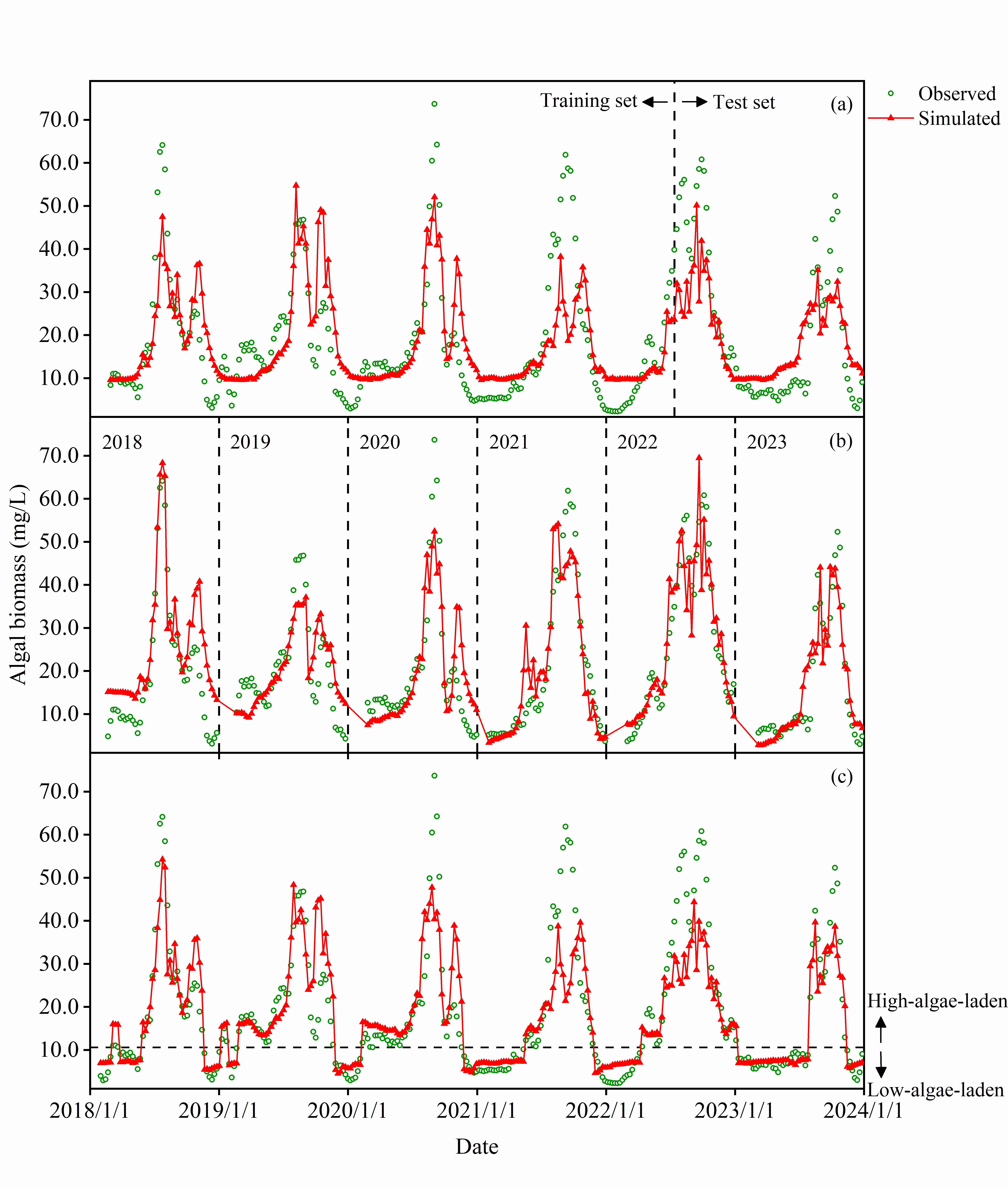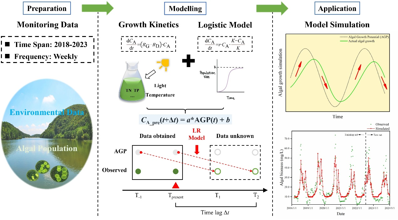 湖泊与水库是全球范围内重要的饮用水来源,富营养化湖泊和水库中的藻类繁殖会恶化水质,严重危及供水安全。因此,开展藻类种群动态预测研究,构建准确、实用的藻华预警模型,对保障供水安全具有重大现实意义。现有的藻华预测模型主要包括基于过程的机理模型和基于数据驱动的黑箱模型。前者虽具强解释性,但结构复杂、参数众多、校准困难;后者虽灵活高效,但缺乏机制理解、泛化能力有限。此外,遥感技术在大尺度水体监测中应用广泛,但对中小型水库分辨率不足,限制了其应用。在此背景下,本研究提出一种融合藻类生长潜力(AGP)估计与藻类丰度实测时间序列数据回归矫正的混合藻类种群预测模型(HAPP),兼顾机制可解释性与数据驱动优势,适用于缺乏遥感数据的中小型水库与湖泊,在中国北方某水库2018-2023年数据集上实现了应用和验证,为水源地藻类动态预测提供了有效工具,也为气候变化背景下的藻华防控提供了新思路。