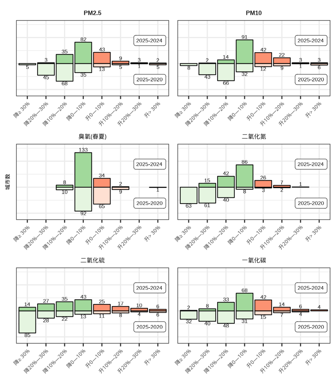 2025 年“4+173”城市六类污染物浓度较 2020 年(浅色柱体)和 2024 年(深色柱体)降幅分组统计频率直方图。