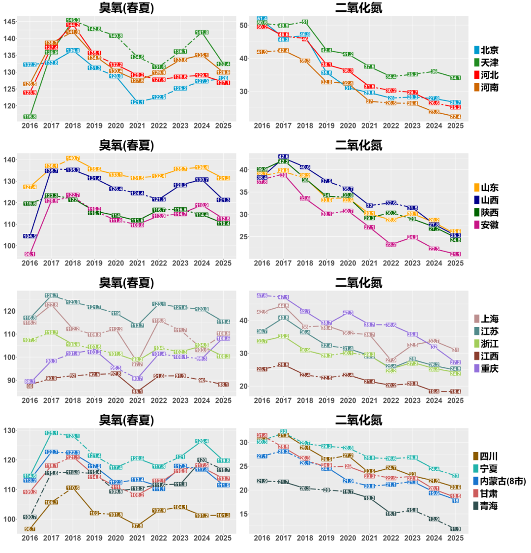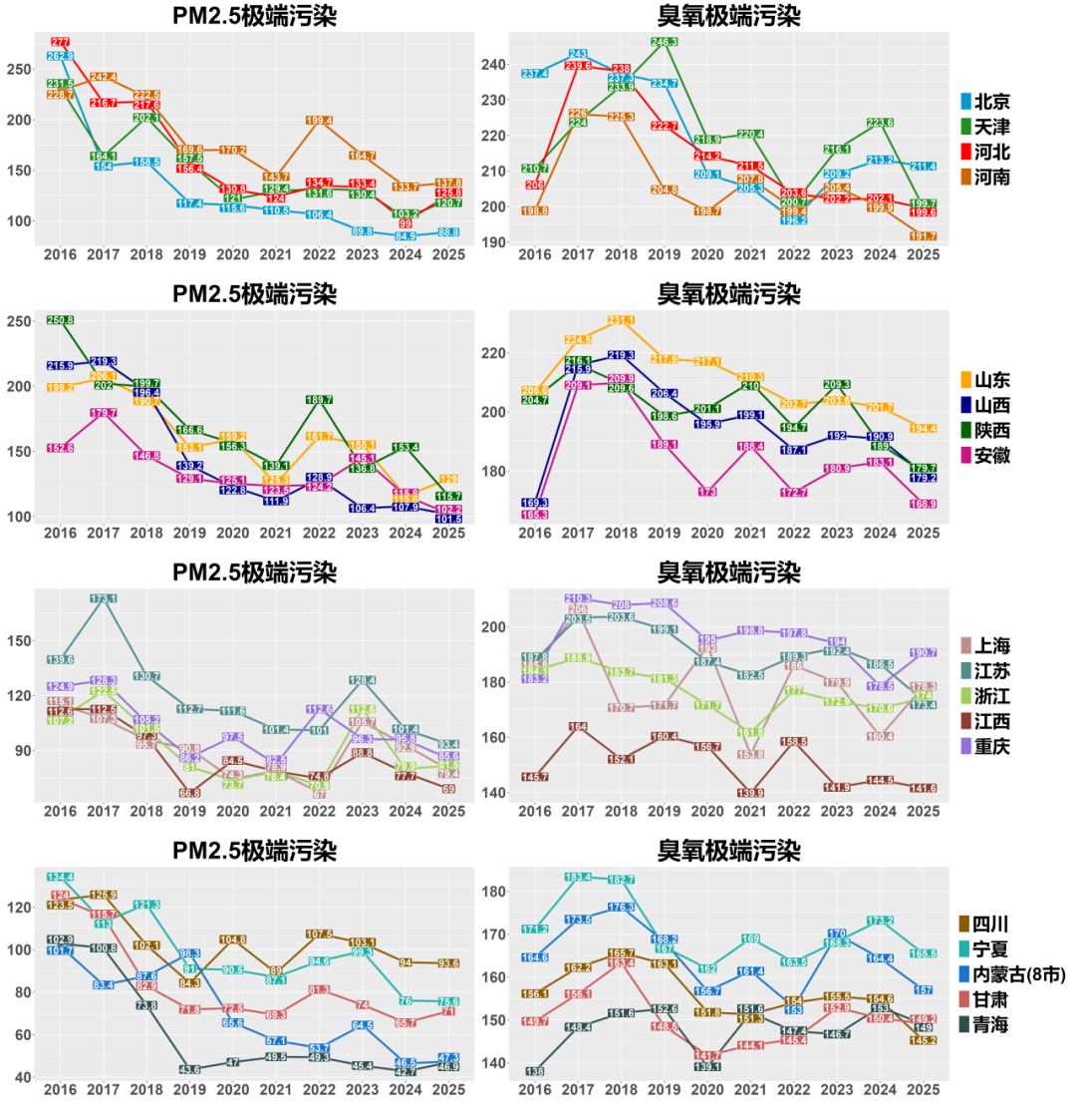 报告审慎指出,这一改善的持续性有待后续年份验证。多数省份臭氧浓度仍高于疫情防控期的低点,重庆、上海较2021年升幅超过10%,北京自2021年起持续上升,2025年已超过河北省平均水平。超大城市臭氧污染问题尚未缓解。