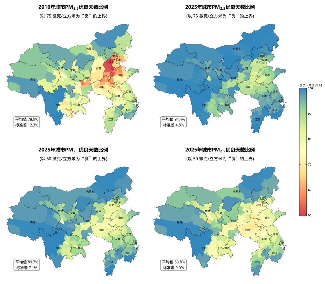 这说明:第一,过去十年的治理积累,为新标准预留了缓冲空间——达标压力没有想象中那么大。第二,更严的标准将重新拉开城市间的差距,对已达标者是继续改善的激励,对尚未达标者是加强治理的动力。