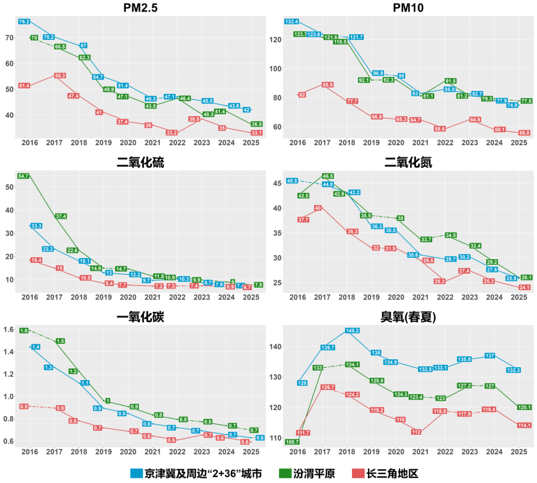 “2+36”城市、汾渭平原和长三角地区 2016–2025 年六种污染物年平均浓度时间序列图