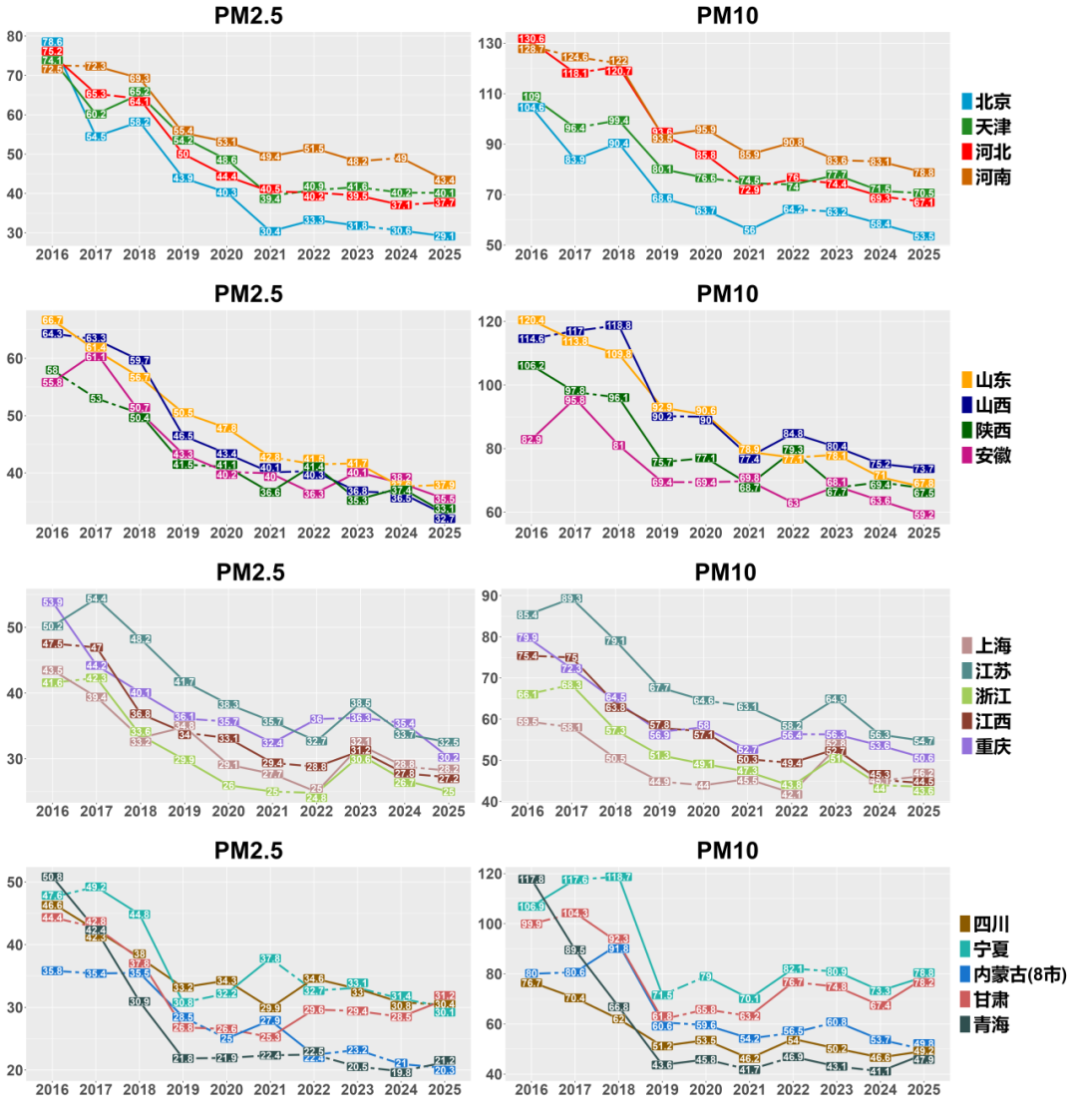 初步评估显示,新增城市呈现出与中东部不同的污染特征。2025年,甘肃酒泉、张掖、临夏等城市PM10年均浓度位居177个城市前列,粗颗粒物问题突出;青海西宁、海东等地一氧化碳浓度相对较高。同时,两省部分城市在2025年出现颗粒物的反弹迹象——甘肃PM2.5与PM10浓度同比分别上升9.5%和16.1%,青海PM10浓度亦有回升。这些新纳入的城市为理解西部地区的污染成因和治理需求提供了重要样本,也提示下一阶段政策需更加关注区域差异化特征。