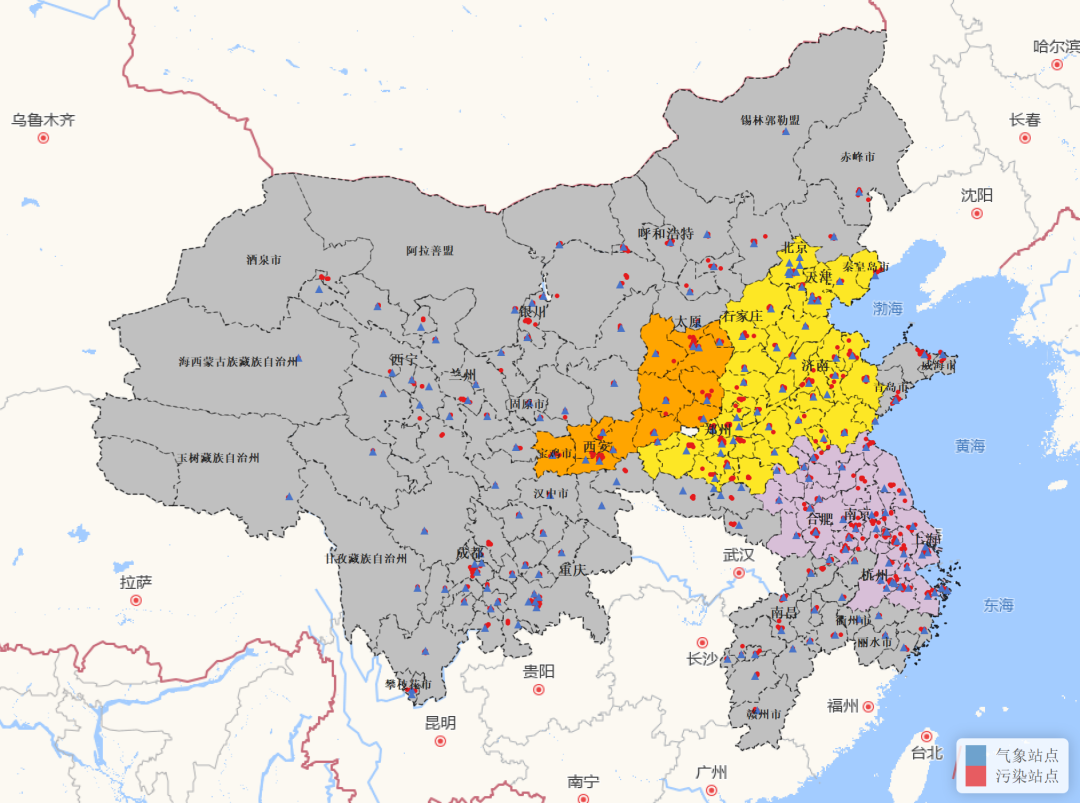 (图中黄色区域为京津冀及周边地区“2+36”城市,橙色区域为汾渭平原 13 市,紫色区域为长三角地区,灰色区域为“其他城市”)